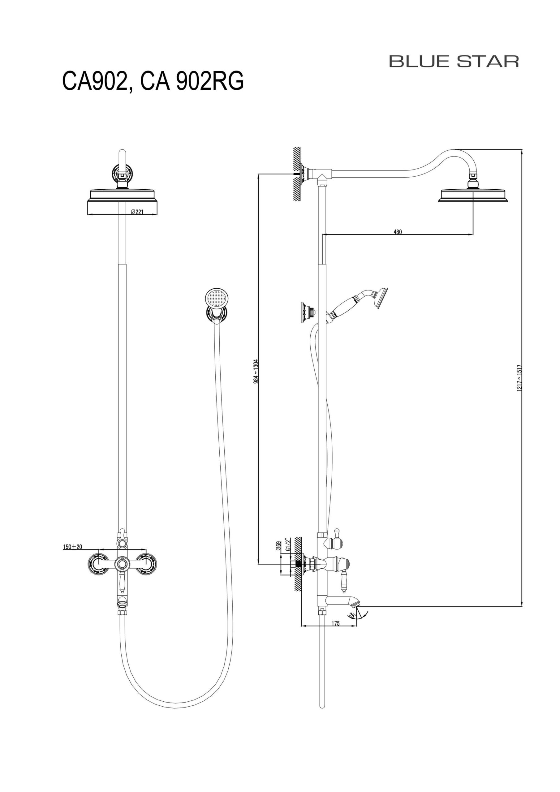 Toote mõõdud: Kõrgus = 1217-1517 mm | Laius = 150 mm | Ülepeaduši läbimõõt = 221 mm