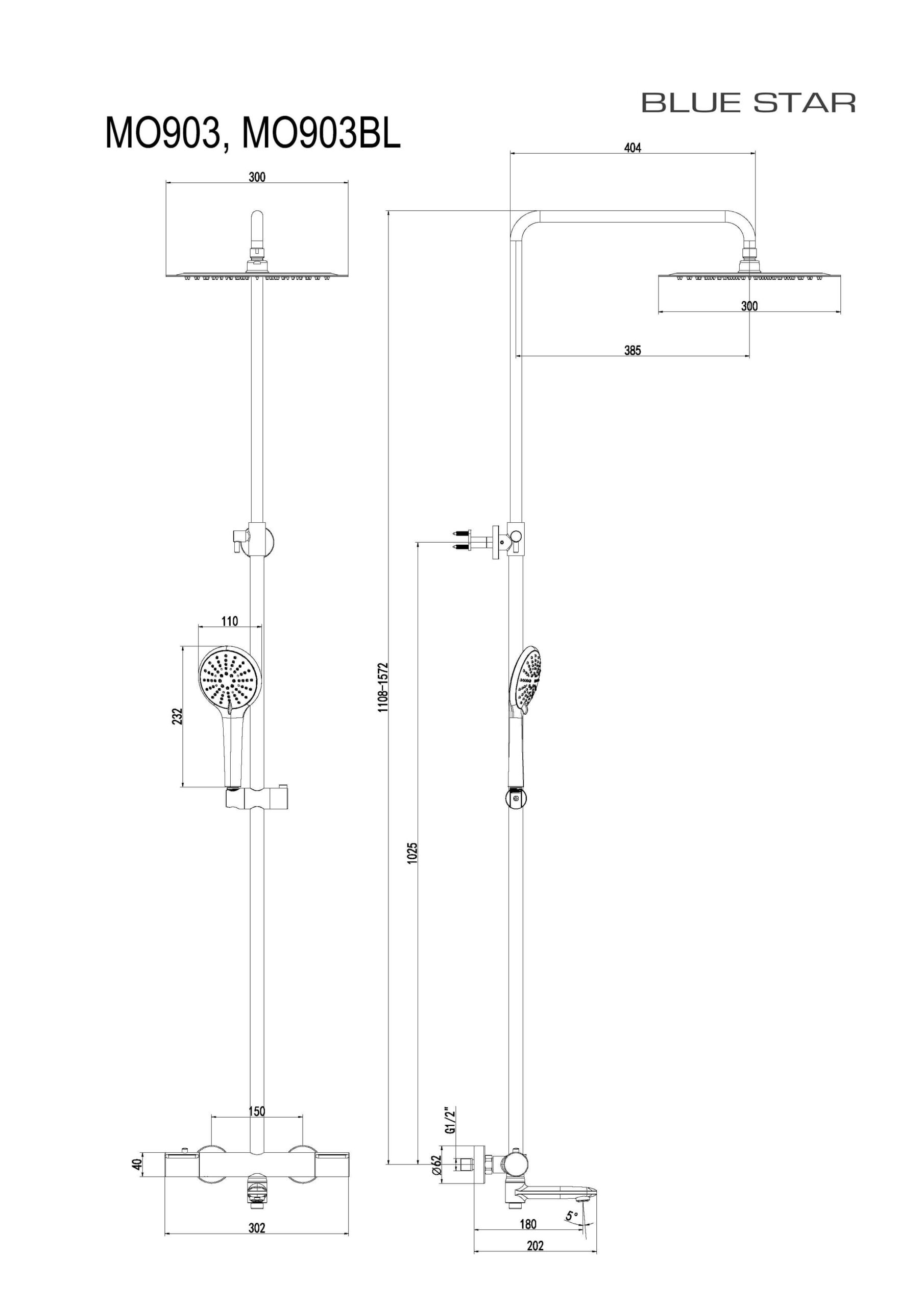 Toote mõõdud: Kõrgus = 1108-1572 mm | Laius = 320 mm | Ülepeaduši läbimõõt = 300 mm